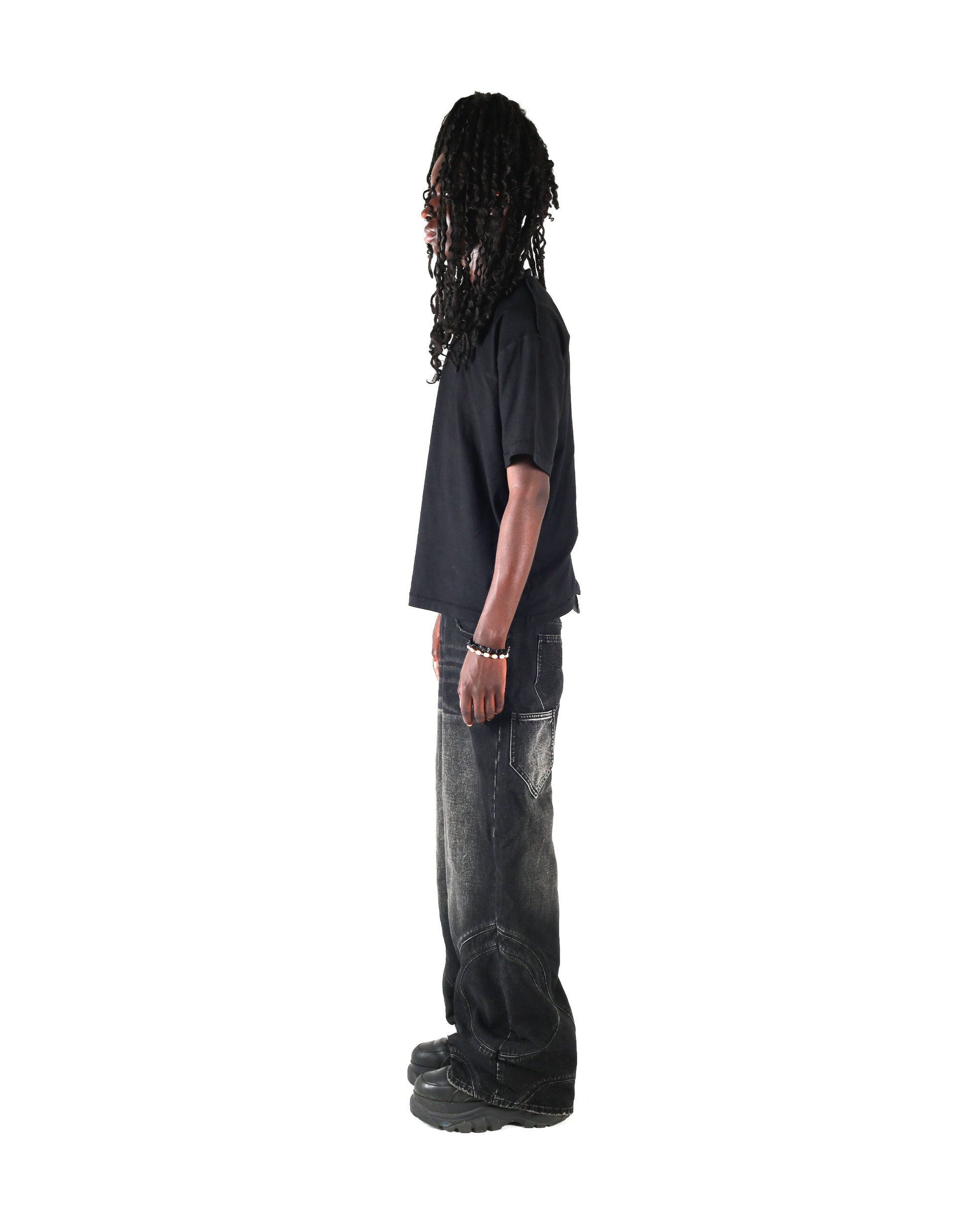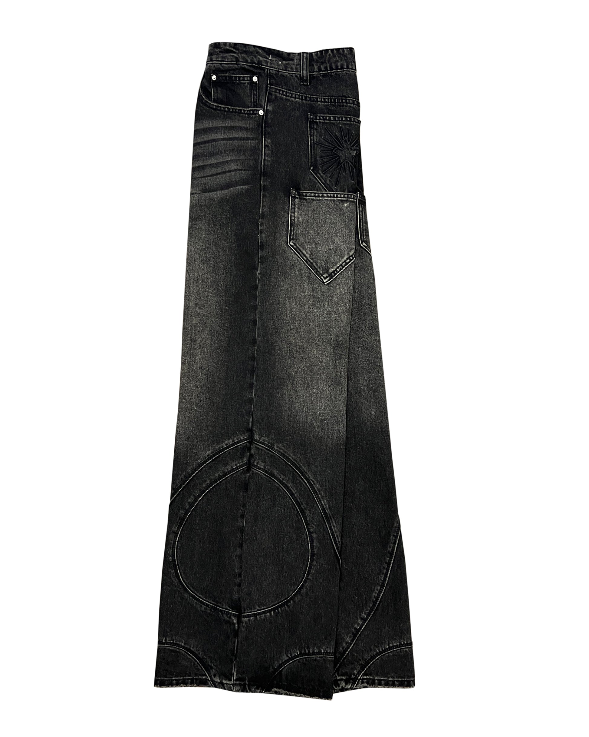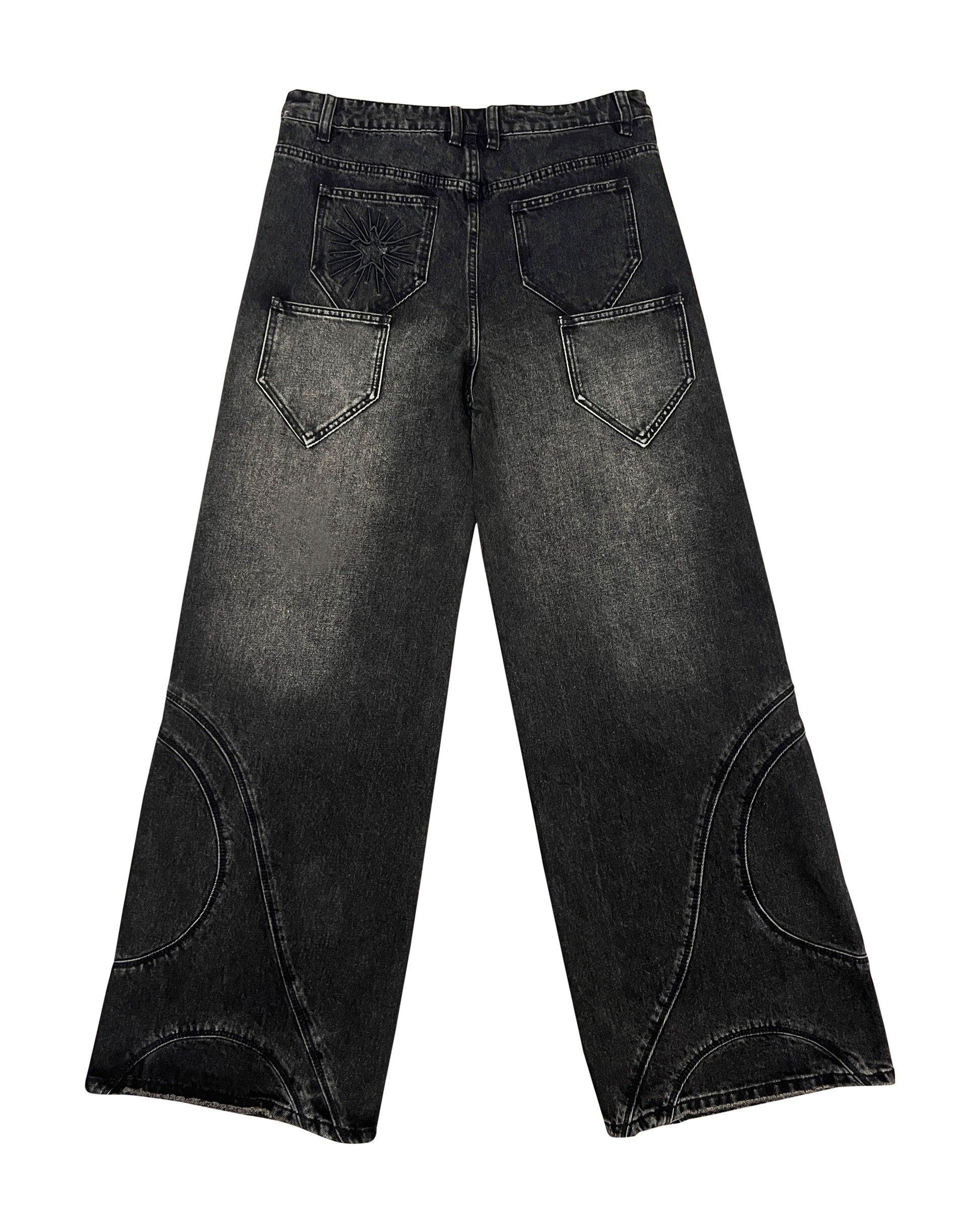 - washed black denim with a unique fade look
